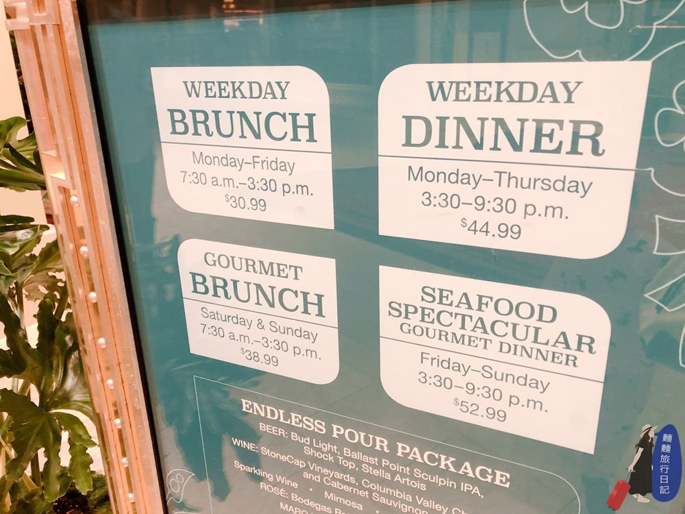 假日 早午餐(六~日) 成人 $ 38.99 美元、晚餐(五~日) 成人 $52.99 美元