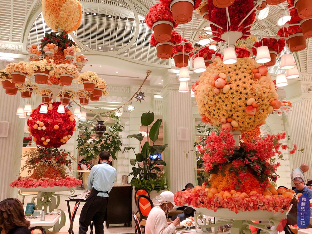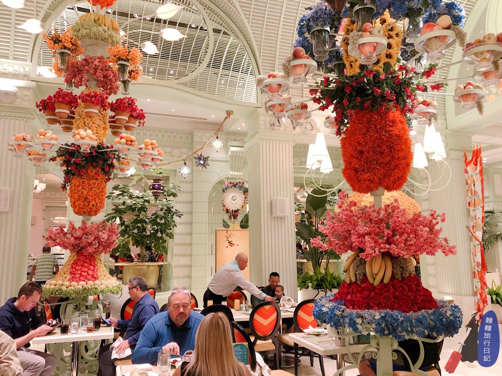 比起凱薩宮BACCHANAL我更愛Wynn Buffet的環境,用大量的花朵、水果來裝飾,這麼多顏色卻不會讓人眼花撩亂,反而有一種童話感,像是在瘋帽子的下午茶派對花園裡用餐,而且整體更時尚、明亮!我愛死了Wynn酒店的設計師!