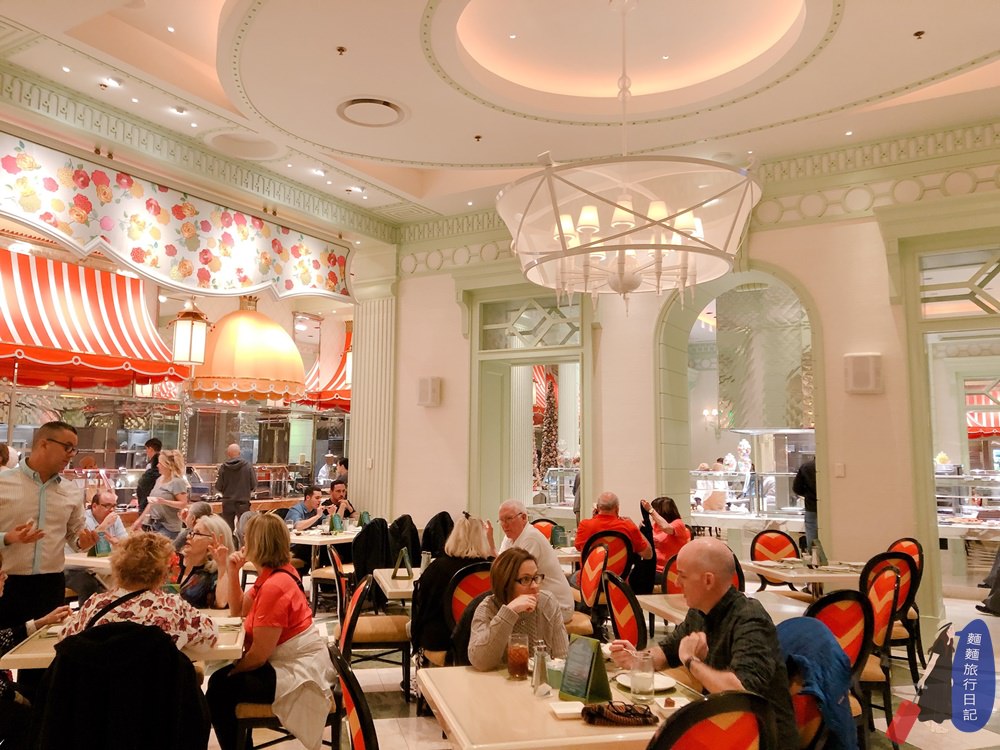 Wynn Buffet 總體來說,雖然總類樣式沒有凱薩宮的BACCHANAL多(BACCHANAL有超過五百樣不同的餐點,是要逼死誰啊),但是中式點心、炒飯炒麵、日式壽司、前菜、義大利麵、披薩、牛排、海鮮等,食物的豐富性還是很足夠的,甜點區超厲害,愛吃甜點的必來朝聖一下,而且老實說味道都很精緻好吃,必吃義大利麵、牛排跟甜點,論環境來說我會覺得Wynn Buffet 的環境更舒適、明亮、時尚,人也比較少一點,用餐時很舒服啊!凱薩宮BACCHANAL人太多的時候,其實Wynn酒店的The Buffet at Wynn 也是很棒的選擇!