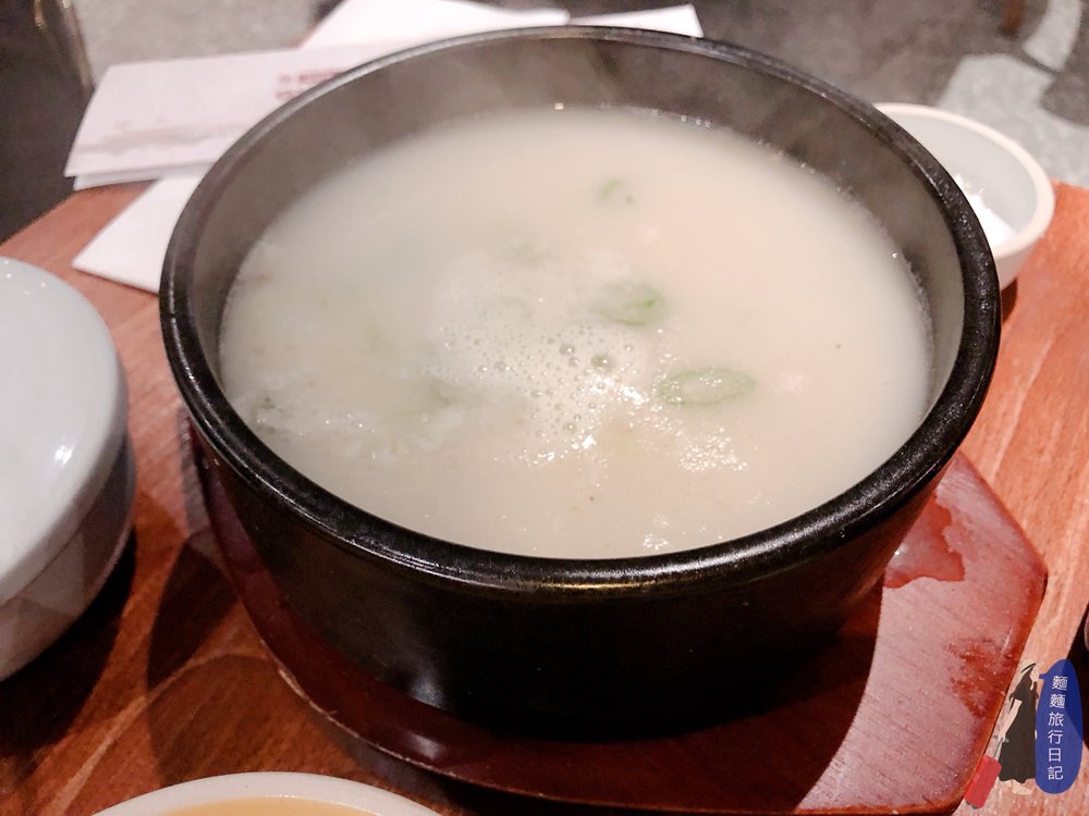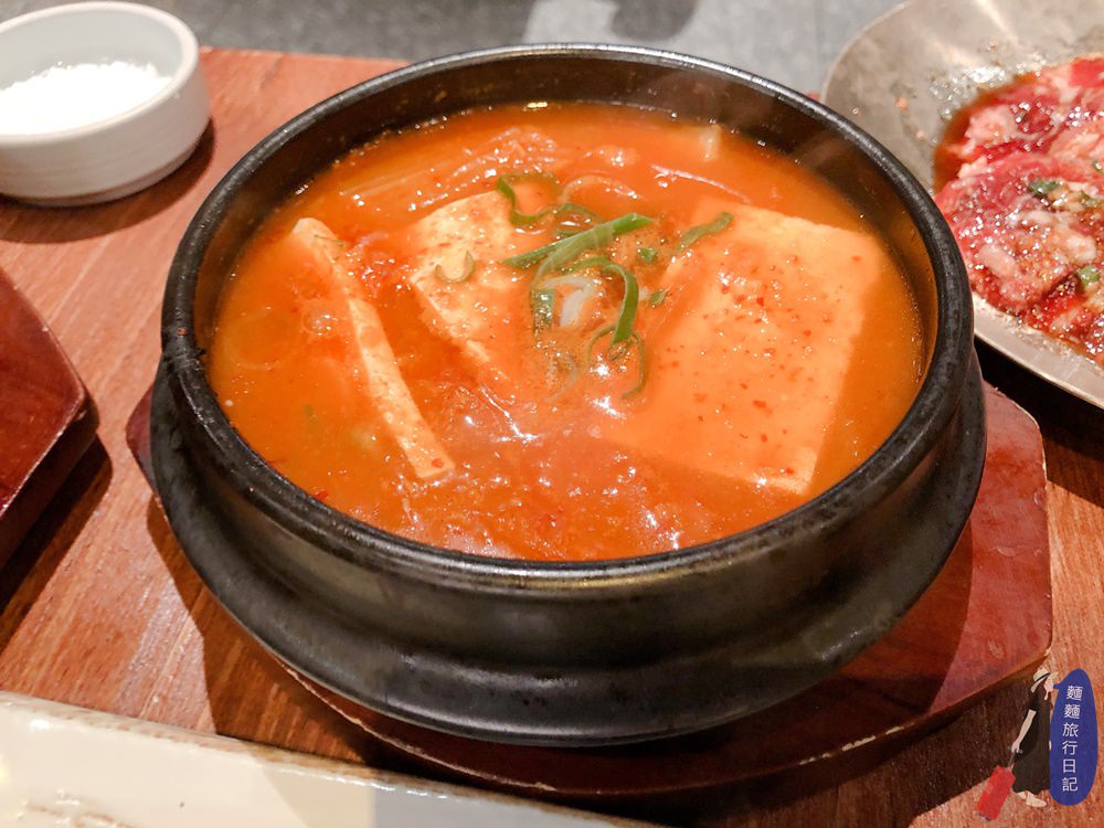 然後是我最愛的泡菜湯,我看過一個韓國廚師說,煮泡菜湯一定要用豬肉才煮才能煮出最好喝的味道,這碗泡菜湯就是用豬肉煮的,裡面還加了洋蔥、豆腐、辣椒跟金針菇,超級酸爽好喝啊!吃一口燒肉配一口熱呼呼又辣呼呼的泡菜湯,神棒。