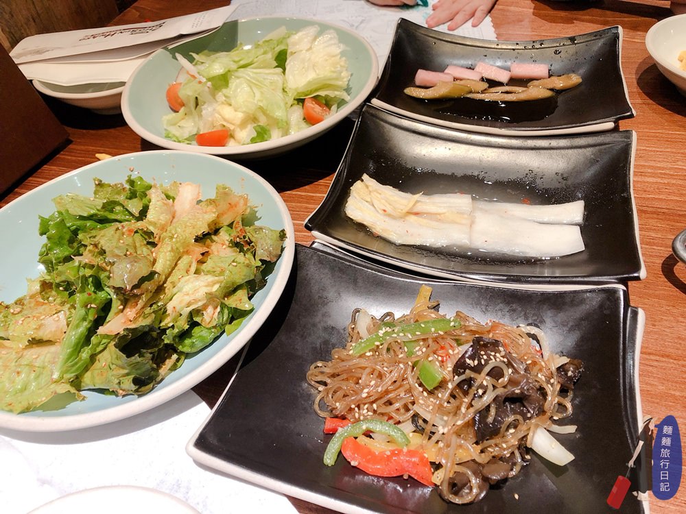 然後只要你有點韓國燒烤,都有附這些小菜喔,有辣的麻辣生菜沙拉,一般的生菜沙拉,韓式炒雜菜,白泡菜,醃蘿蔔等。