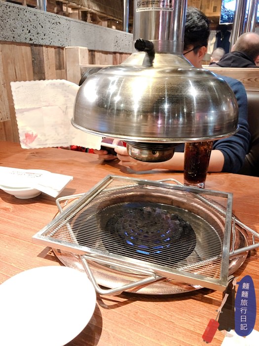 這個烤爐形狀很奇特啊~烤爐上方有一個可以拉高拉短的手動吸油煙機,所以烤肉的時候煙飄上來馬上就被這個神奇的手動吸油煙吸塵器吸走了,吃完走出去身上也沒有什麼烤肉燒烤味。