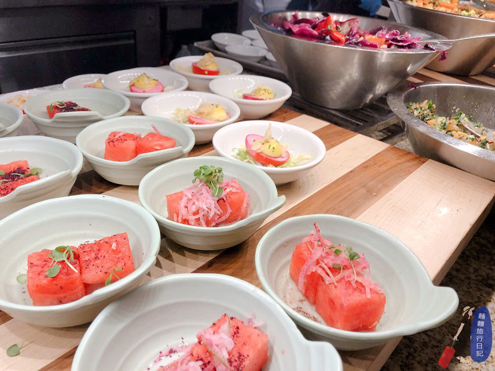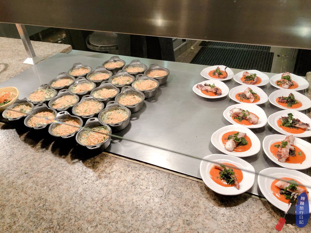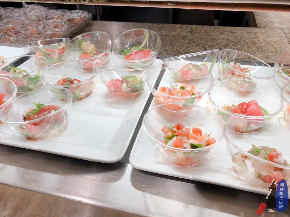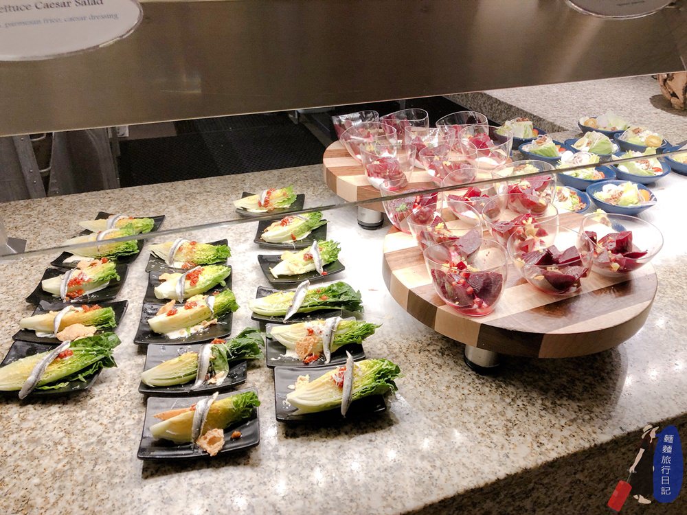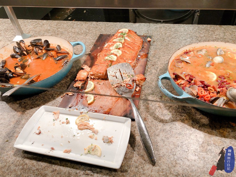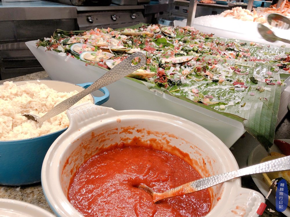 - BACCHANAL的用餐時間分為早午餐跟晚餐時段,兩個時段的菜色不一樣,晚上有豪華海鮮,中間不清場,分水嶺是下午三點之後會開始出晚餐,我們誤打誤撞2點多來排隊,3點初入場,結果用午餐的價格吃到晚餐的菜色。