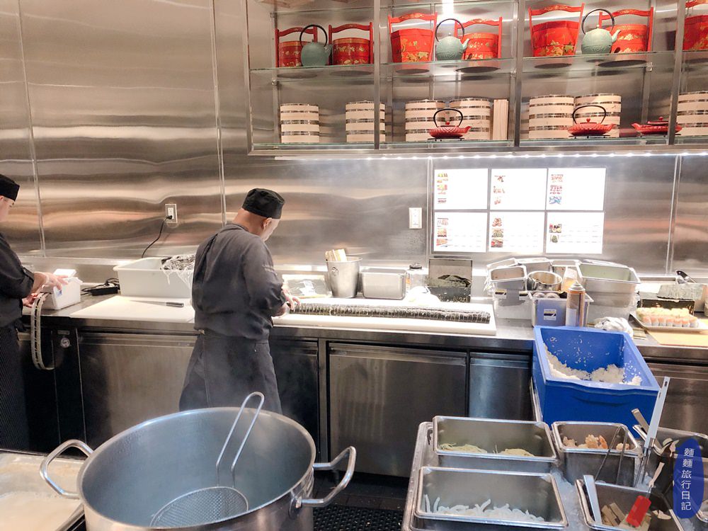 取餐的吧台後另一邊就是廚房喔~所以可以看見廚師料理的過程,後面的廚師正在切捲好的海苔壽司,超長的海苔壽司耶~