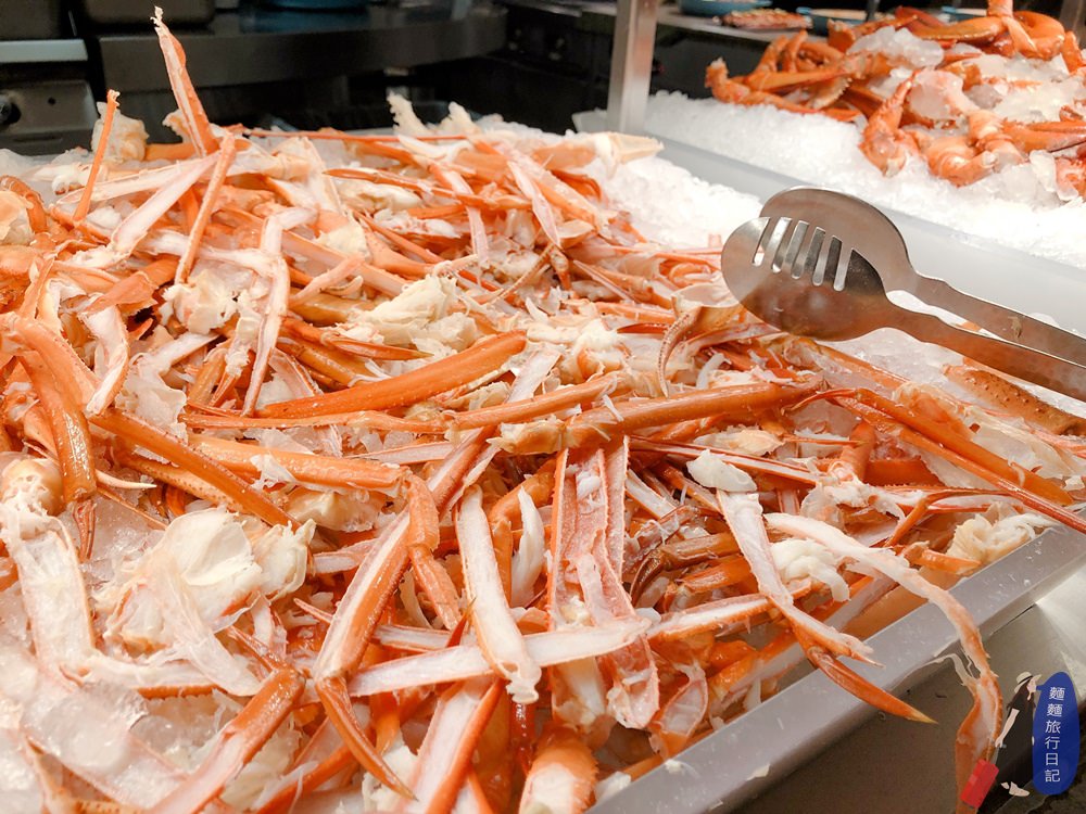 熱呼呼水煮過的帝王蟹腳,就這樣鋪在冰上,剛出爐的話還可以夾到熱的帝王蟹腳耶~我看著廚師撈起來後,馬上夾了一大盤蟹腳,這裡要說一下美國的海鮮幾乎都是冷凍的,不是像台灣一樣追求尚青、新鮮、活跳跳喔~ 而且拉斯維加斯在內陸,在這裡可以吃到大量的海鮮真的很棒唷!因為是冷凍的所以品質不一,大家要盡量挑選肥一點帝王蟹腳,吃起來才會肥美鮮甜啊!