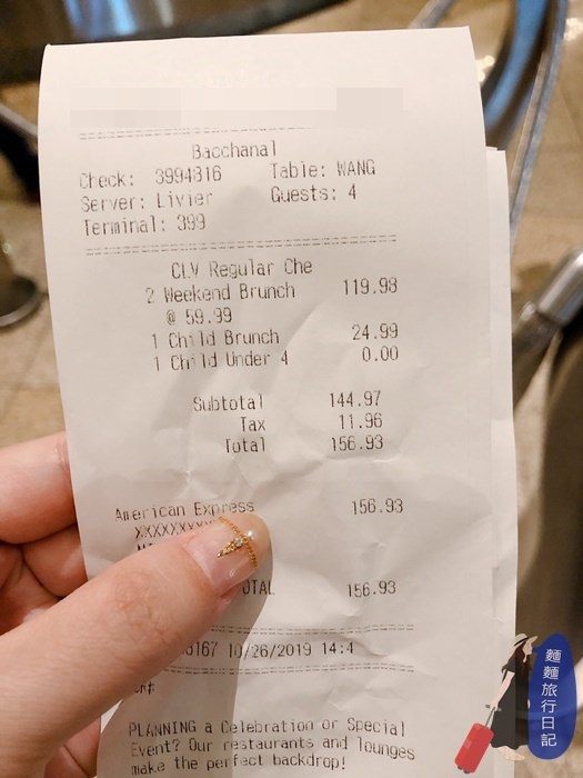 BACCHANAL是先結帳買單後,服務生才會帶你入座,我們這天是假日的早午餐時段來用餐,一個大人是 $ 59.99 美元、波仔是 $ 24.99 美元、樂樂不用錢,孩童4歲以下免費耶~