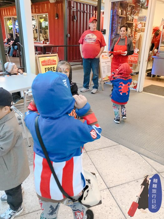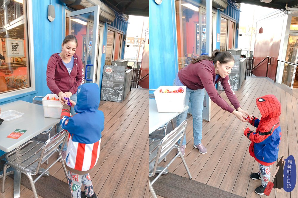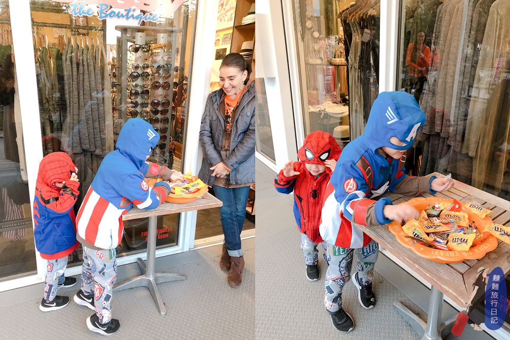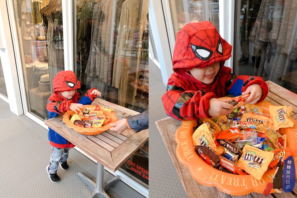 吃飽喝足後就是波仔跟樂樂最期待的Treat or Trick時間囉!園區內的不給糖就搗蛋的萬聖節特別活動,店家會在門口放糖果,發糖果給搗蛋的小朋友喔~波仔跟樂樂準備好去要糖果啦~~~