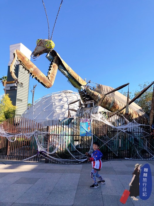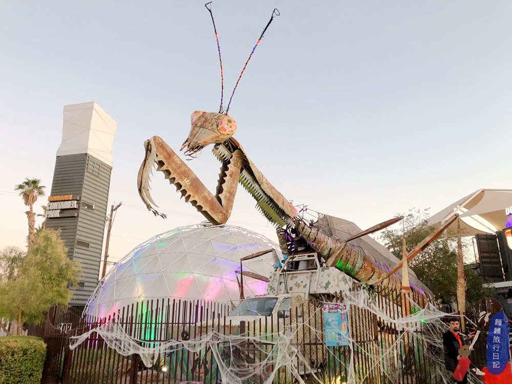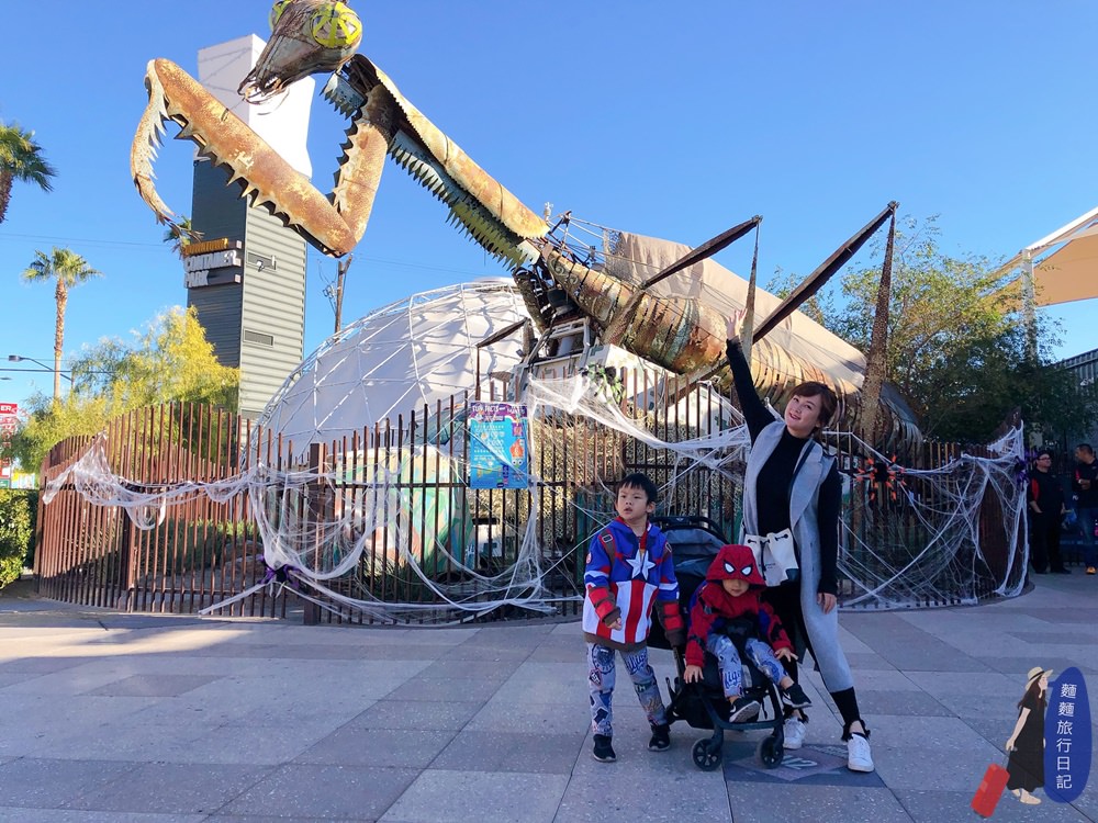 【美國】Las Vegas拉斯維加斯必去景點:Downtown Container Park 舊城區貨櫃公園,超大螳螂、放風小孩、參加萬聖節不給糖就搗蛋活動!