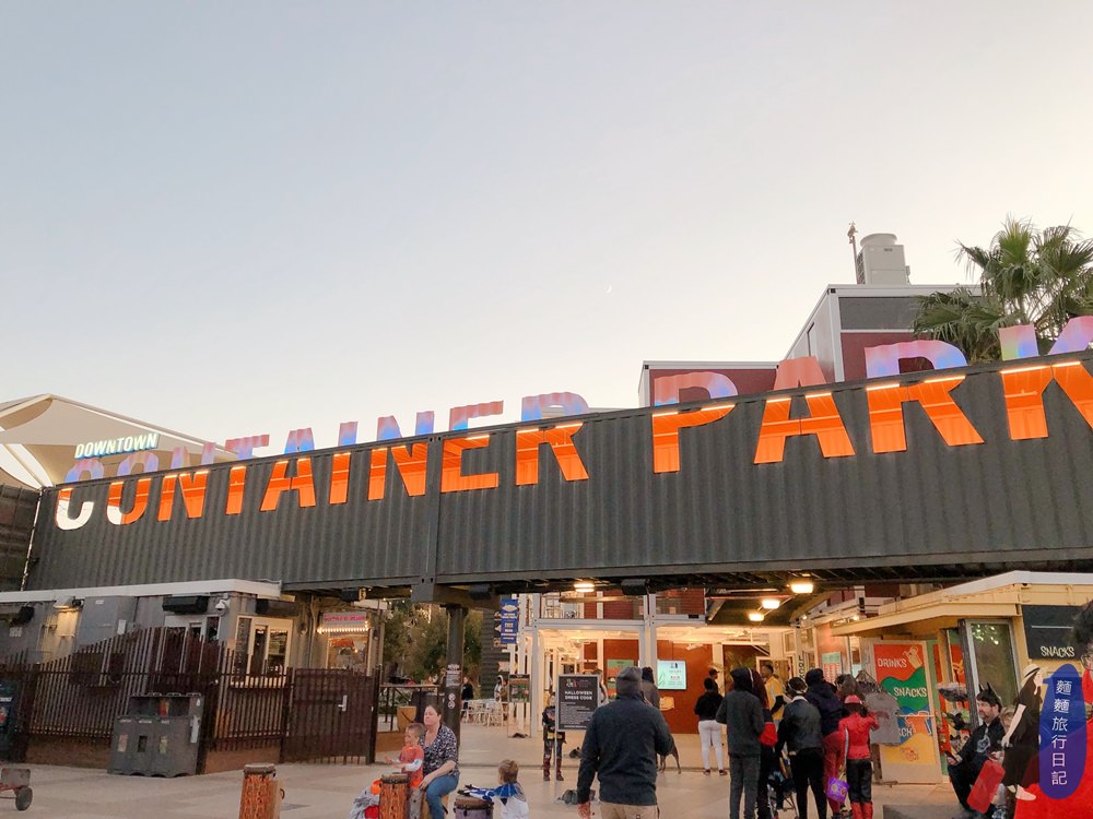 Downtown Container Park 舊城區貨櫃公園就在弗蒙街Fremont Street上,從拉斯維加斯舊城區步行街繼續往下走就會到貨櫃園區囉~貨櫃園區非常適合溜小孩啊!今天來拉斯維加斯的主要目地其實是要讓波仔跟樂樂在園區裡盡情奔跑玩耍,今天剛好是萬聖節,順便參加傍晚開始的treat or trick 萬聖節活動!