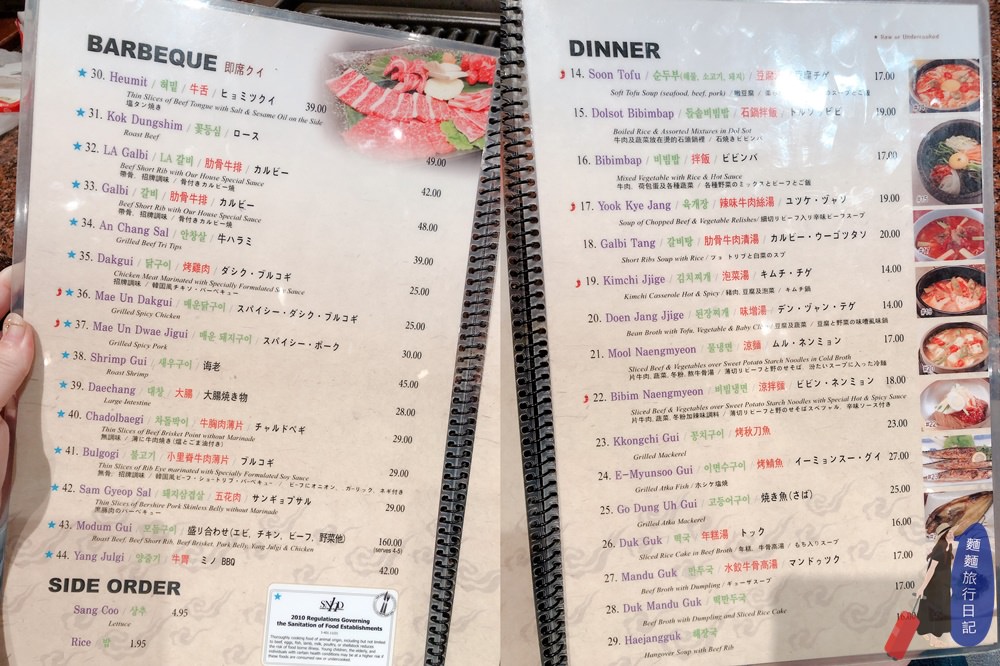 左邊是單點的燒烤肉類,右邊是石鍋拌飯、韓式拌飯、泡菜湯、辣牛肉湯、年糕湯等。