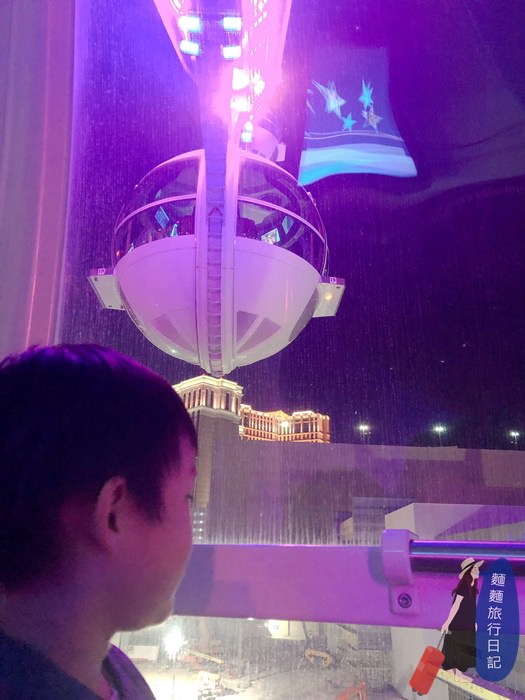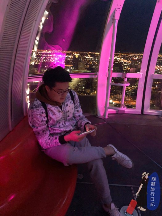 摩天輪裡面的視野非常好欸,360度都是玻璃落地窗設計,窗外的拉斯維加斯夜景真的是被我拍的一清二楚,水噹噹!就連波仔看到眼前的美景也終於消停片刻!