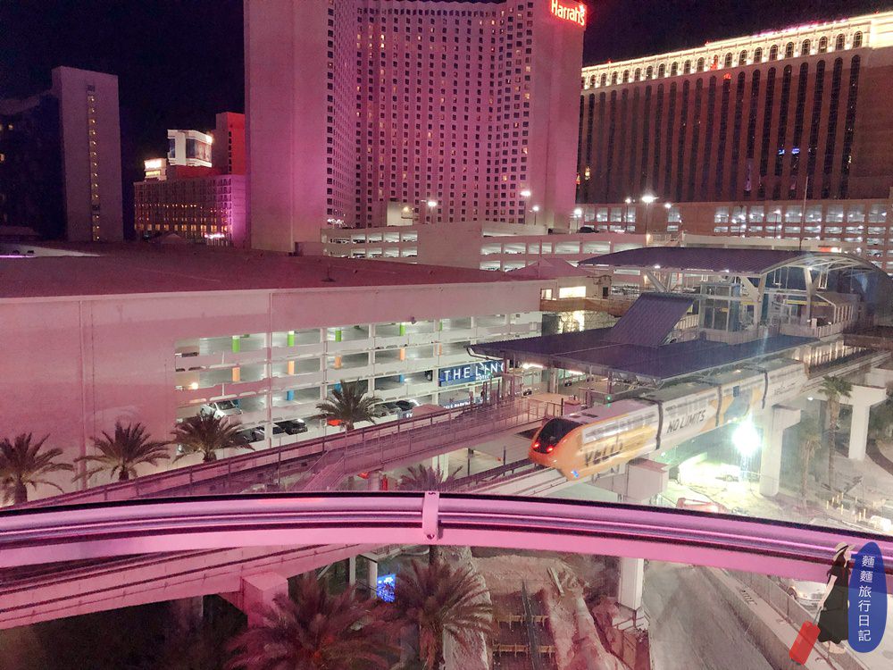 摩天輪慢慢往下轉囉!可以看見拉斯維加斯的大眾運輸單軌電車,很像子彈一樣的車軌。