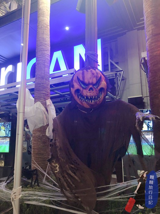 我們來的時候剛好接近萬聖節,一路上都是超級恐怖的裝飾,我來美國不管在洛杉磯還是聖地牙哥看到的萬聖節裝飾都很可愛,來到拉斯維加斯真的是整路被嚇,賭城這邊根本是精華區,最可怕!這隻南瓜臉會隨風擺動超逼真,嚇屎人了,波仔看到後倒退嚕三四步,說媽咪~他會動耶!