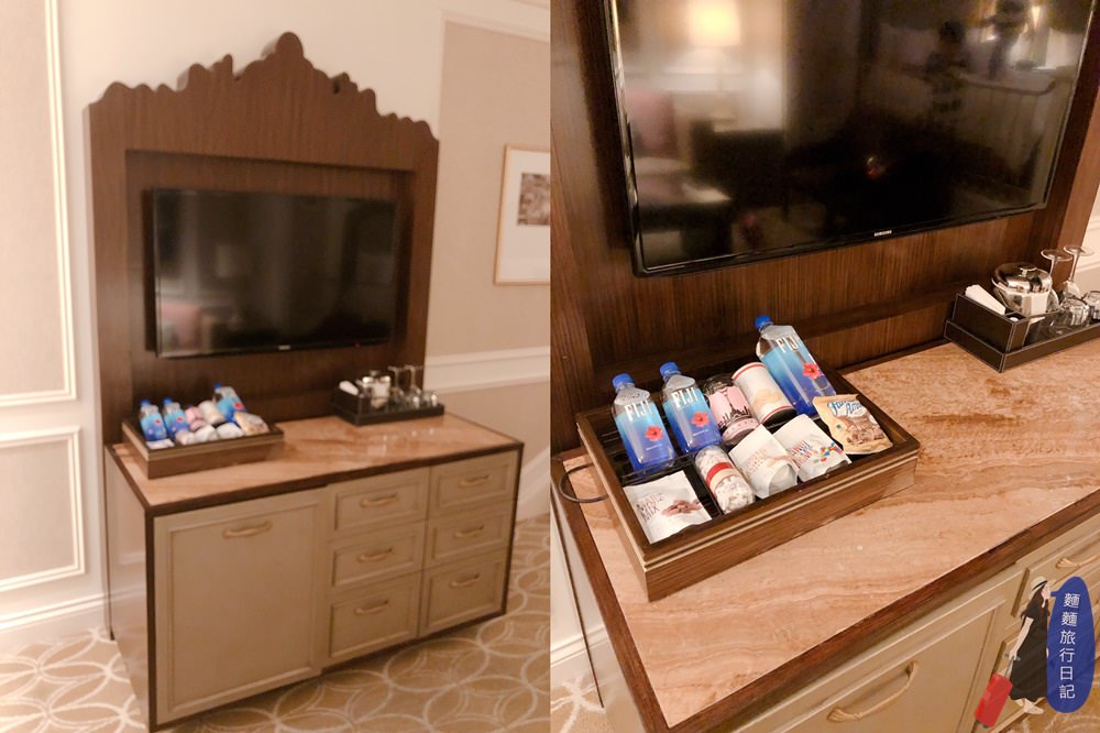 客廳區的電視下方是茶水櫃,在美國是使用者付費,水、飲料、餅乾零食啊!都是要收費的,所以千萬碰不得啊!尤其飯店的價格又會更貴了,一進門馬上把Mini Bar的零食收高高,免得小屁孩亂拆開來吃。