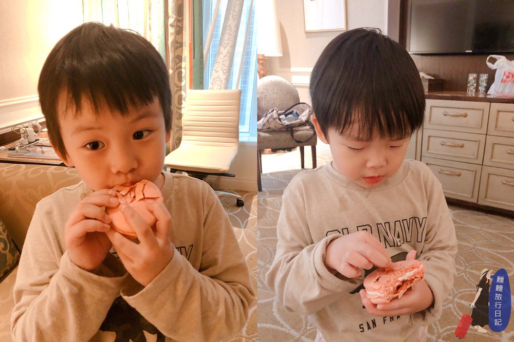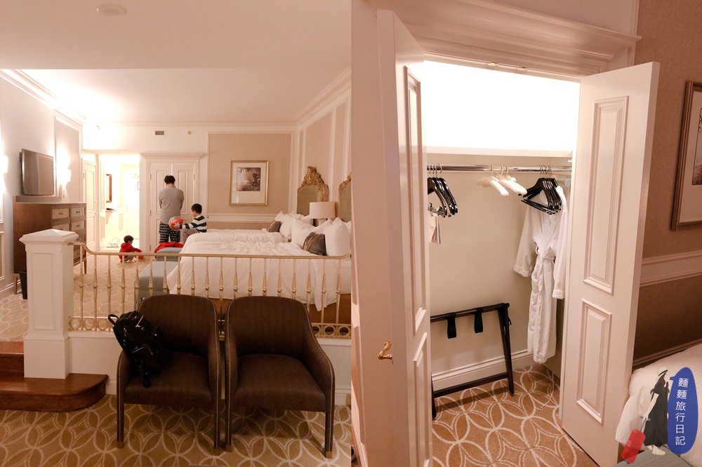 住的是套房喔!有臥床區跟客廳區。我們家進酒店房間後,波仔跟樂樂各種脫~脫外套、脫鞋子、脫襪子,這兩隻現在很忙,然後大猴就會媽媽上身,一進門馬上四處檢查門窗安全,然後把所有會讓屁孩發生危險的物品趕快收起來,你們說大猴是不是神經質爸爸?! (攤手) ,村長除了拍房間照外,還忙著收酒店房間裡Mini Bar的零食收高高,省的下一秒被波仔跟樂樂全拆了,這裡可是美國啊!房間裡Mini Bar跟冰箱裡的飲料可都是使用者付費!!!很貴。