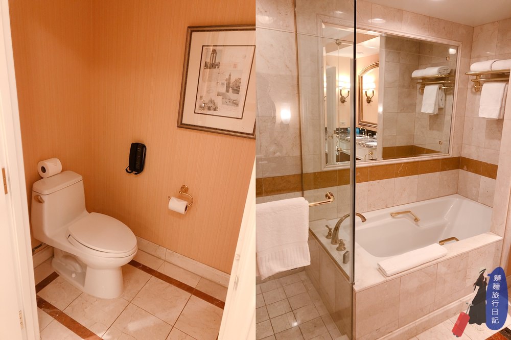 馬桶跟日本飯店港款,是獨立一間~ 淋浴間跟浴缸也是分開的,我超愛這種設計,等於我們一家四口都可以同時使用浴室啊! 波仔跟樂樂說,哇~麻麻這家飯店都是金色的耶!因為鋼鐵人的關係,波仔超喜歡紅色跟金色。
