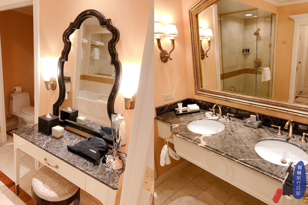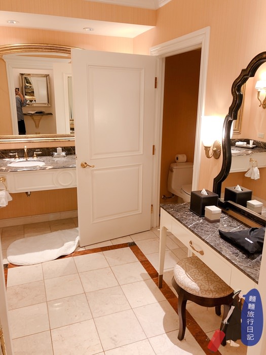 而且浴室裡面竟然有梳妝台,會不會太高級~~~ 住在這裡覺得自己好像歐洲時期的貴族喔! 而且還是雙洗面台捏~很讚很讚! 洗面台上所有金屬材質也都是金色。