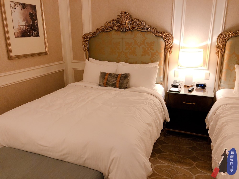 房間裡的床頭鑲著金邊、連牆上的畫也使用相同風格的金框,真的是金光閃閃~不知道為什麼有種公主床的感覺。