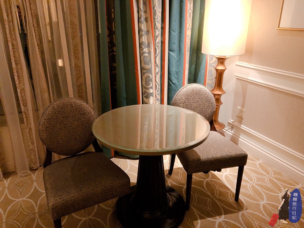 臥床區跟客廳區用圍欄(圍欄也是金色)、上下階梯區分,客廳區也超大,有一組沙發桌椅、書桌、靠窗還有另一組桌椅(不知道這麼多桌椅要幹嘛XDD)、跟茶水櫃,客廳區一樣有一台電視喔~