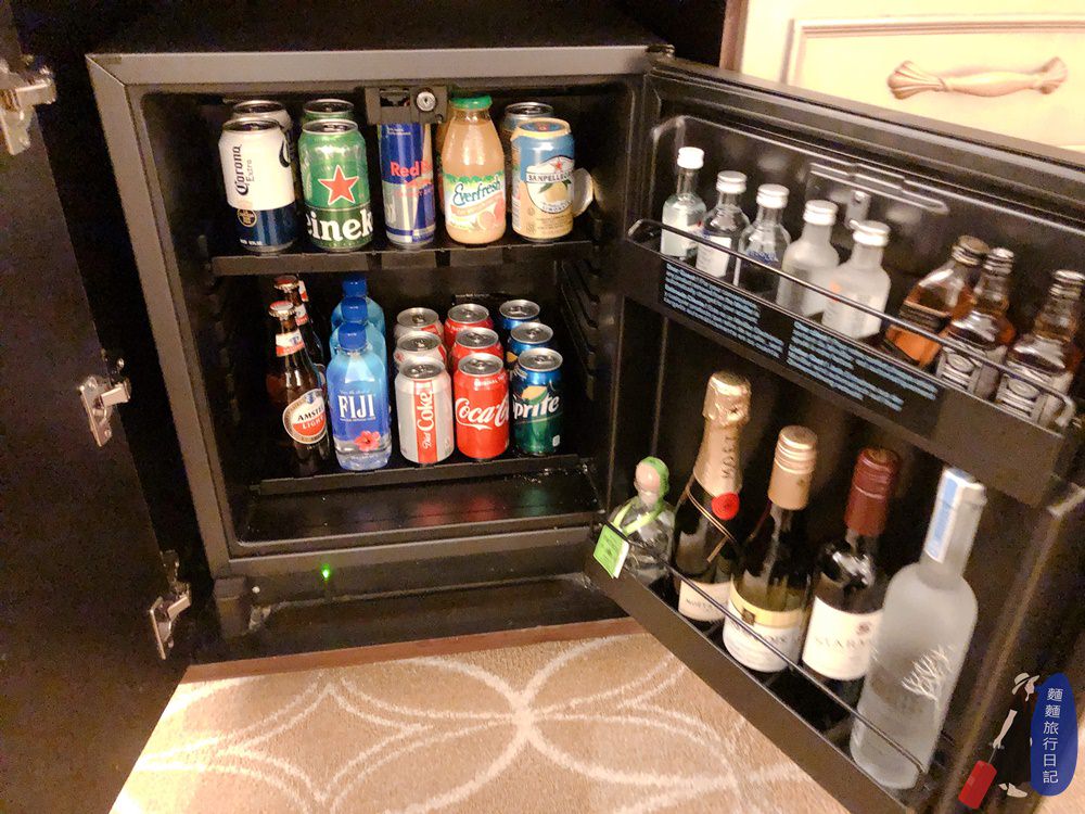 我收完Mini Bar的零食才打開冰箱,看了傻眼!這一堆飲料我要拿大鎖來才擋得住屁孩的魔爪吧!琳瑯滿目的飲料、酒,買尬。