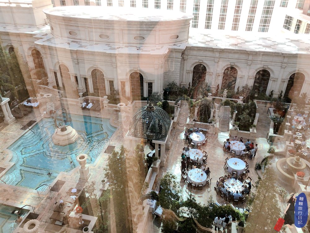 這是隔天起床之後,拉開房間窗簾的景象,可以看見酒店泳池跟用餐的中庭。