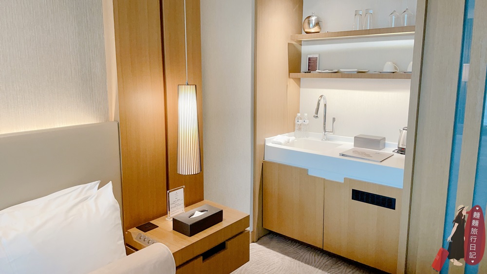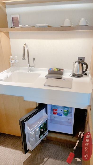 床的另一側有簡單的茶水櫃、小冰箱,覺得滿不一樣的設計是茶水櫃居然還有設計一個獨立的洗手台欸!洗手還是洗茶杯就不用特別跑到浴室了很方便!