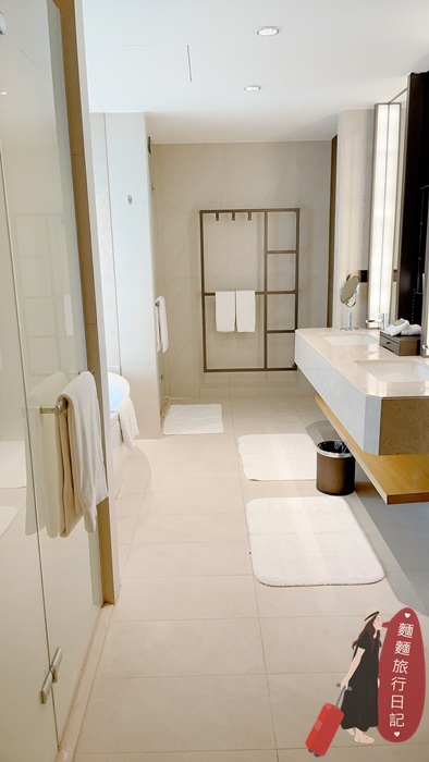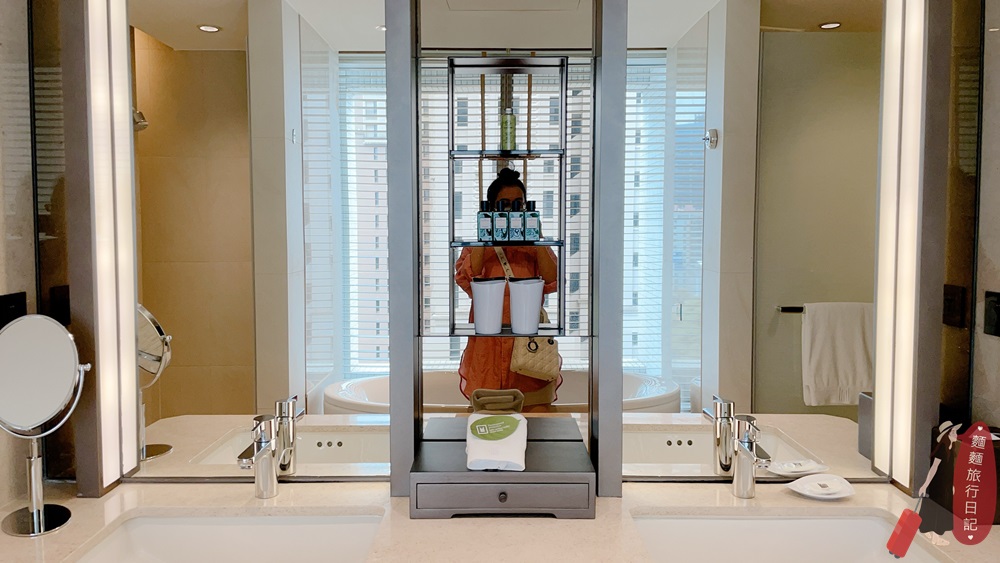浴缸對面就是超大雙洗面台區~中間的架子上整齊地擺放了沐浴備品。