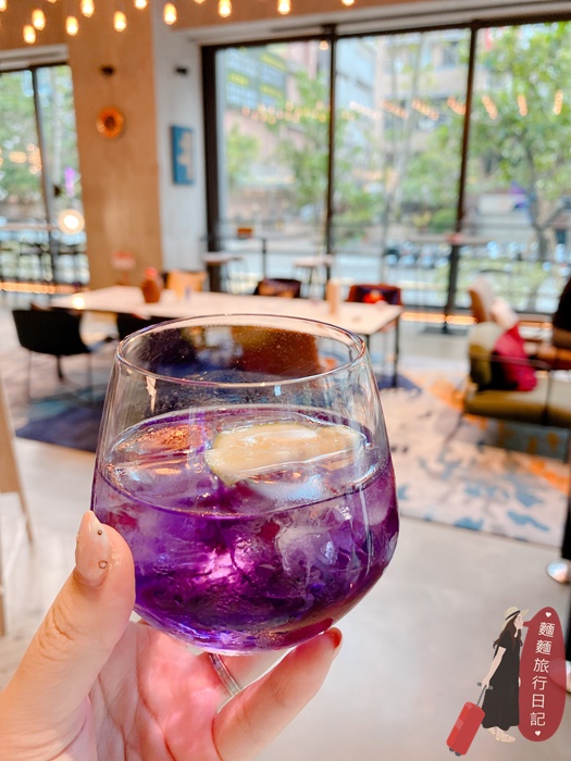 櫃檯上也有迎賓小點心,迎賓飲料有蝶豆花氣泡飲跟酒精珍珠奶茶,我選的是蝶豆花氣泡飲,蝶豆花本身沒有什麼味道,喝起來就像氣泡水。
