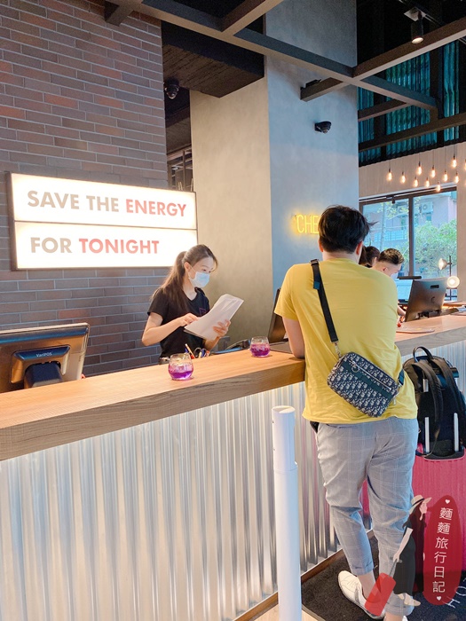 MOXY酒店一樓大廳是美式工業休閒風,大猴正在辦理入住,辦理入住時服務提供了迎賓飲料。