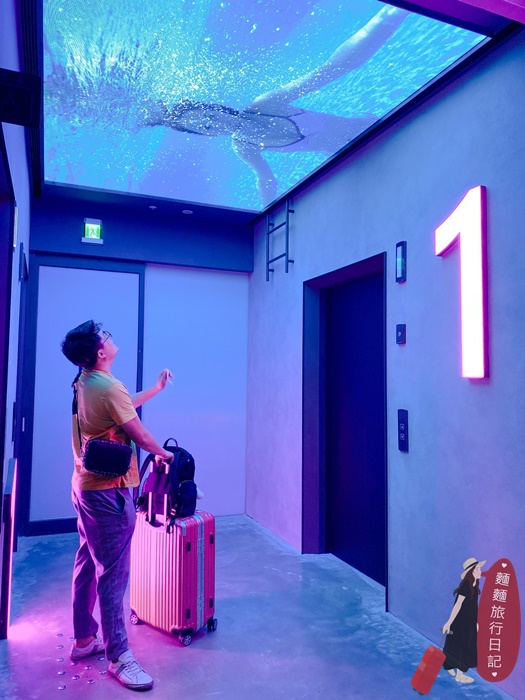 電梯間也很特別,抬起頭會有人遊過來跟你Say Hi~電梯裡面還有出頭喔!一部電梯的鏡子是讓身體變細長的哈哈鏡、另一部是變胖短的,很趣咪。