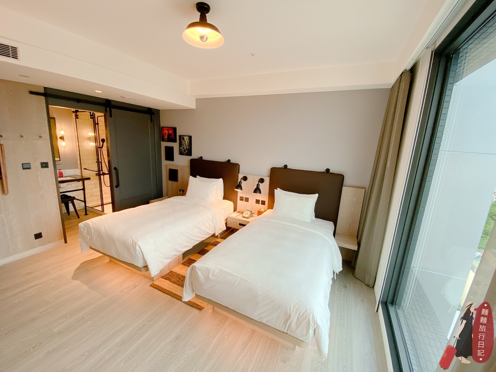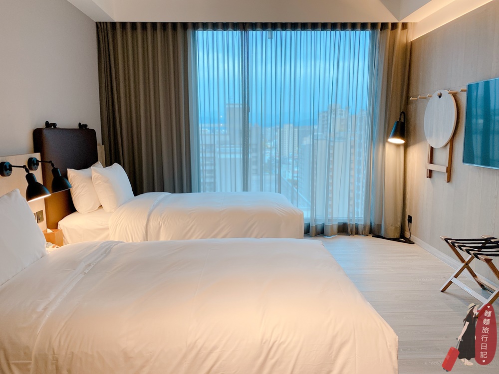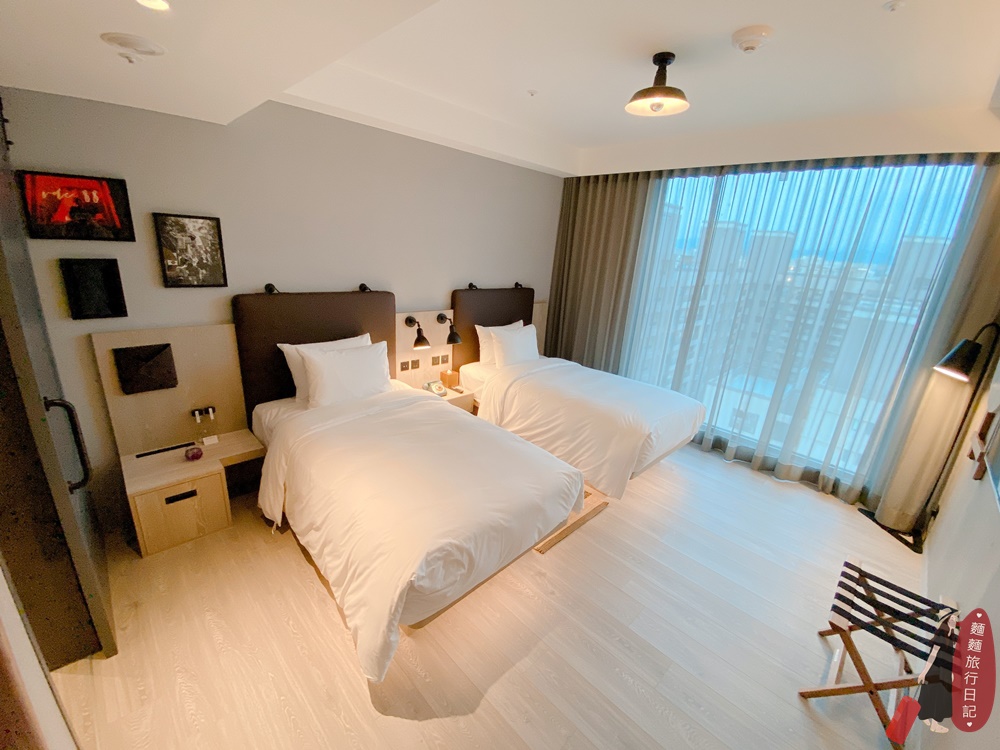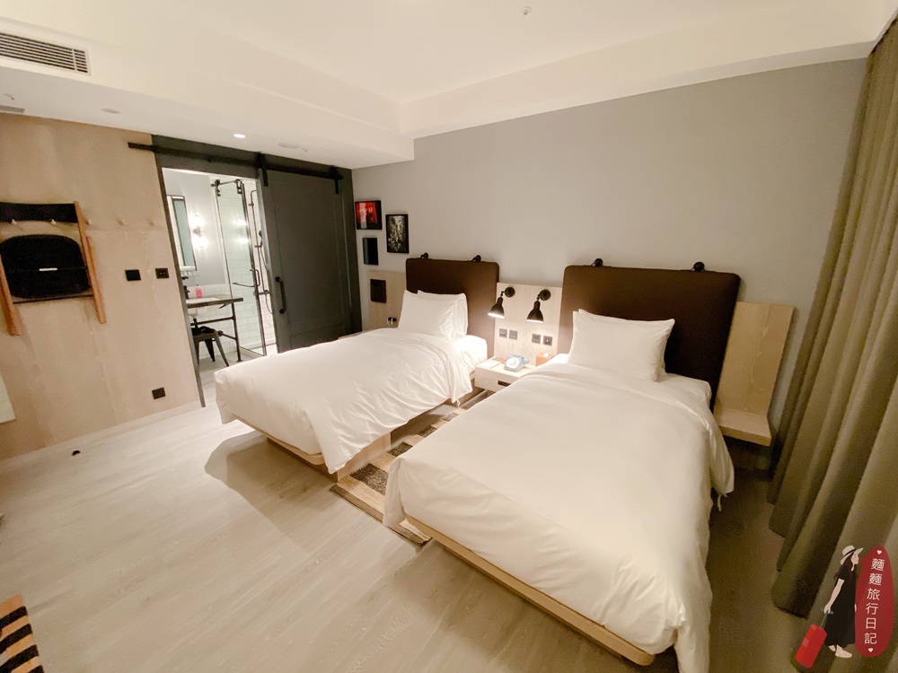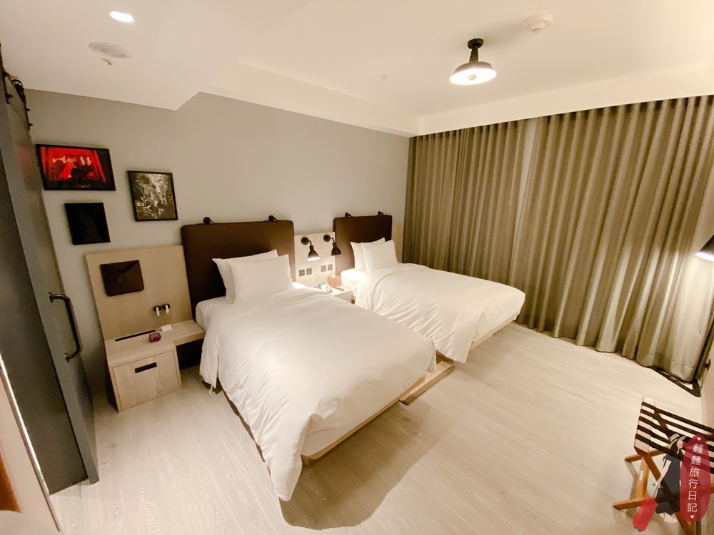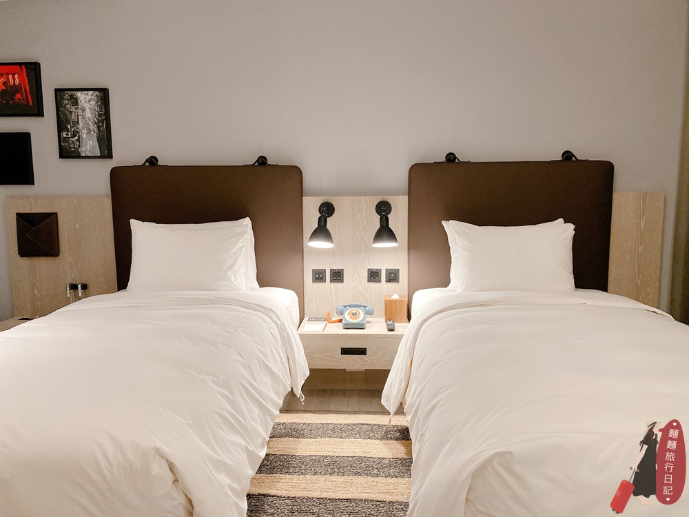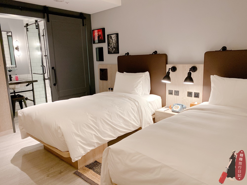 Moxy酒店總共有262間客房,有三種房型可選,分別是標準、高級跟豪華,跟一般的飯店不同的是Moxy酒店房間坪數不大,希望讓旅客不要待在房間裡,可以到一樓的公共空間,因為我隔天要早起考試,以不互相干擾完原則(怕吵醒大猴),訂的是兩張單人床房間。