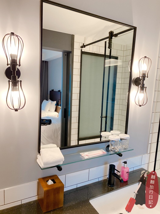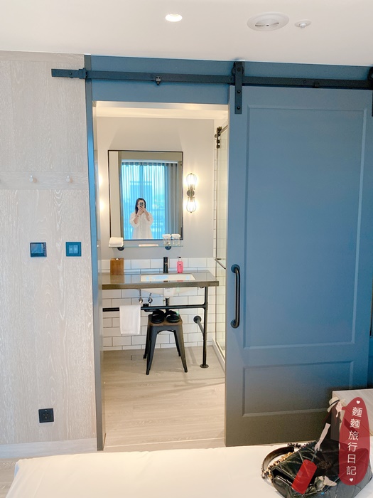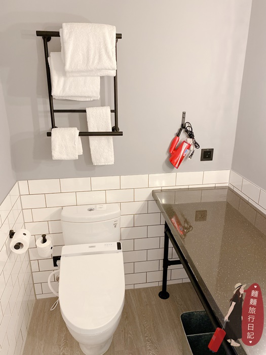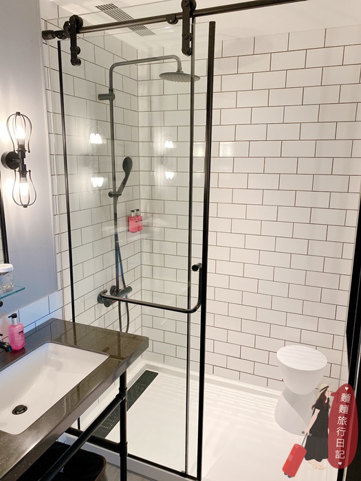浴室是另一個時尚領域,也很好拍,備品只有提供簡單的牙刷,如果需要其他備品,要自己去一樓櫃台拿(很年輕化的感覺),還好我不管去哪都會自己帶。