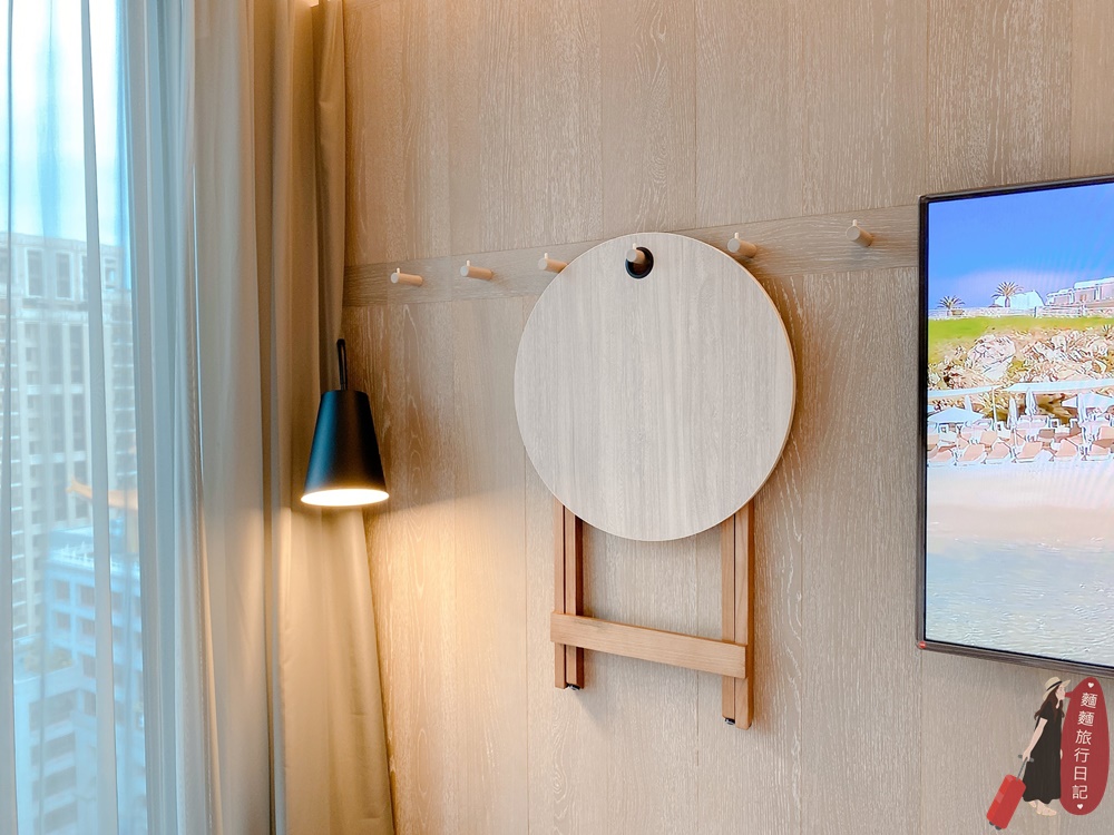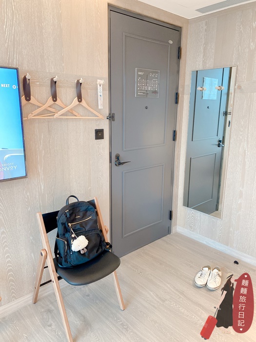 桌子、椅子、行李架都是摺疊的,大門進來就是正方形的房間,沒有玄關空間,門後有一面鏡子,我拿椅子放我的包包。