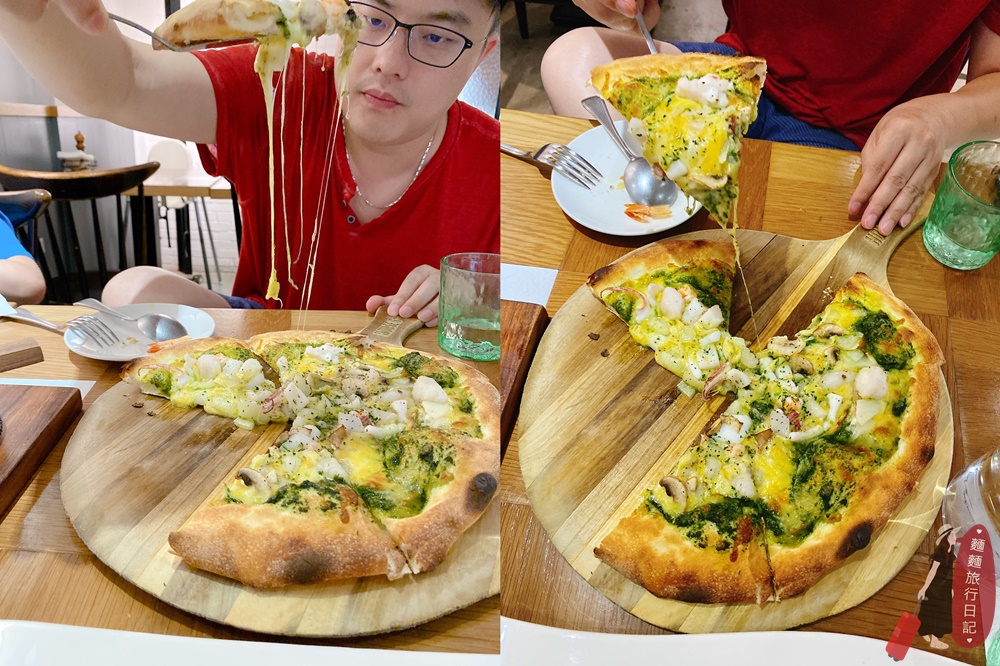 如果人多聚餐的話,建議必點披薩啊~我們點的是青醬海鮮披薩,很大一份,披薩上鋪了滿滿的海鮮料!