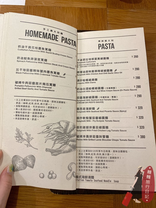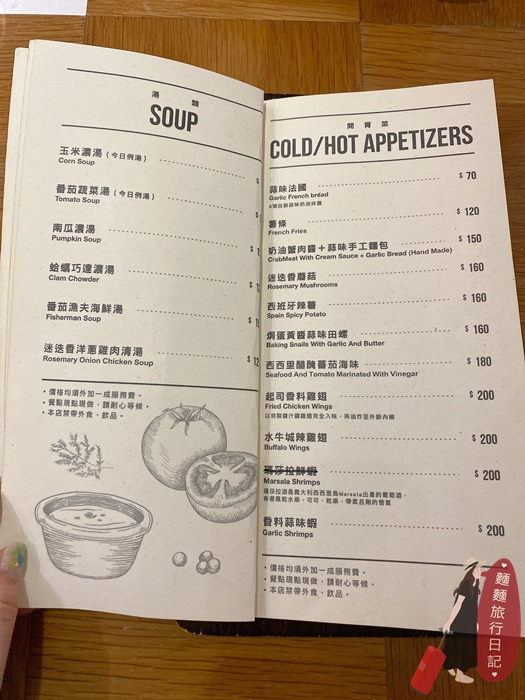 跟一般的義式餐廳一樣~菜單前頁是湯跟開胃菜,但是湯真的是我看過最多品項的,看你要喝濃湯還是清湯,還有茄海鮮湯,我很愛喝很熱的湯,每一種都好想點一碗來喝喝看!