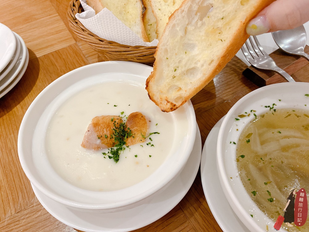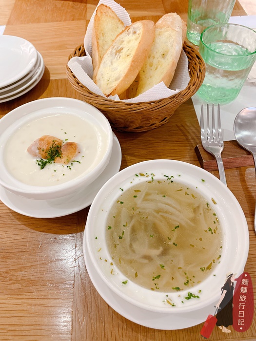主餐加$120元可享今日例湯、蒜味法國麵包、飲料(咖啡、紅茶、奶茶、果汁擇一)喔~覺得很划算!選了洋蔥湯跟玉米濃湯,洋蔥清湯非常清淡,跟村長一樣吃重口味的不建議點~