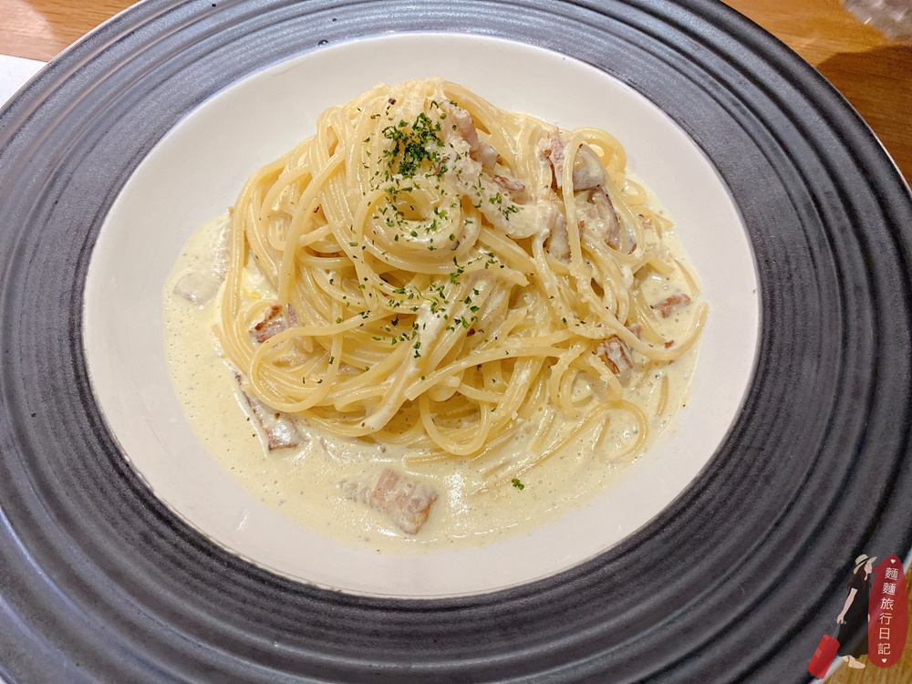 卡波那拉培根蛋黃義大利麵非常好吃!波仔跟樂樂都超級愛!香氣十足、奶味濃郁,滿分沒話說!
