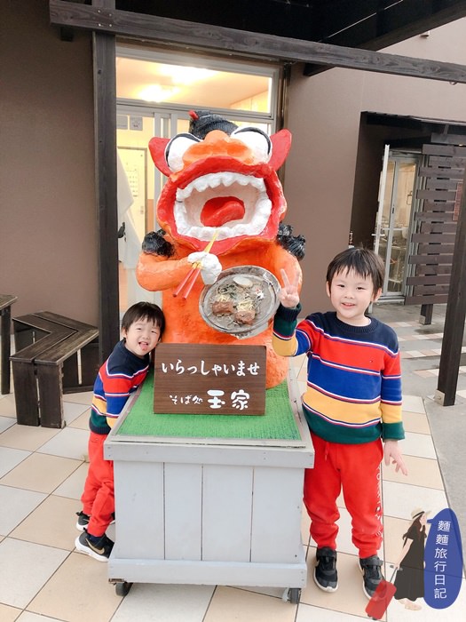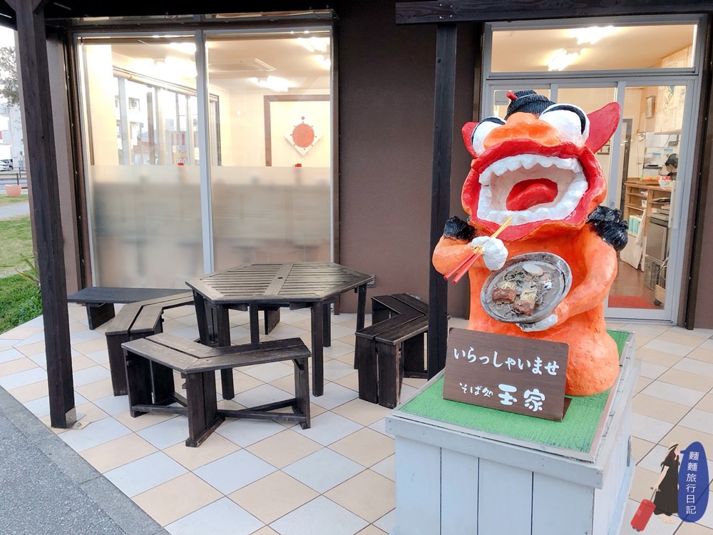 餐廳前面有一個桌椅,提供排隊後位的旅客可以稍作休息,門口有一隻可愛的風獅爺在吃玉家沖繩麵。