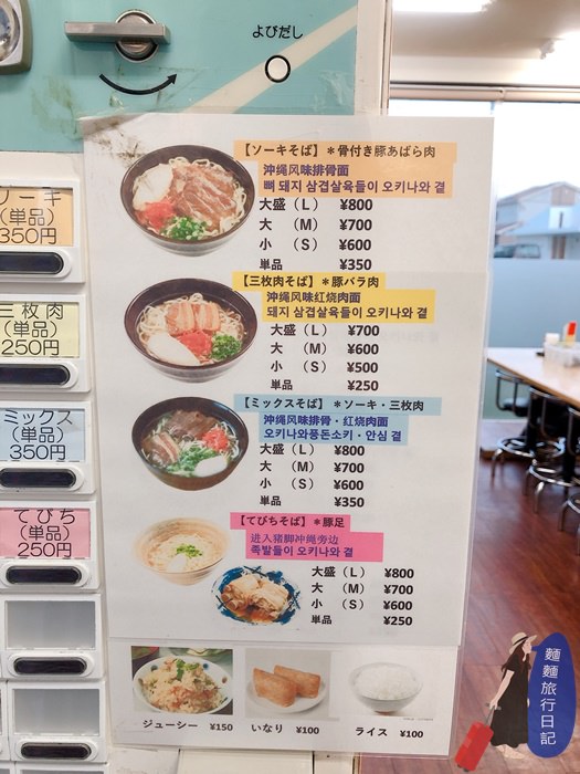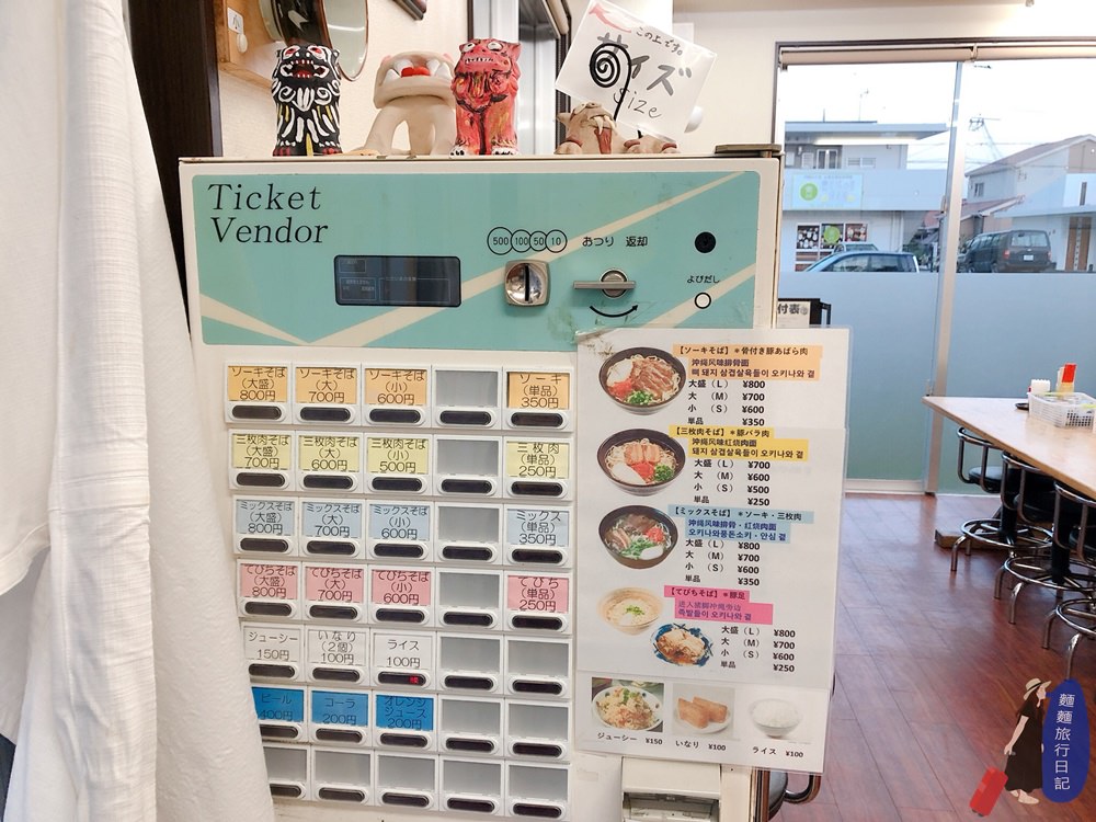 餐廳門口進來之後,就擺了一台點餐機,決定好餐點後,要自己過來點餐機點餐喔!只賣三種口味的麵,分別是排骨、三層肉跟豬腳肉,麵還分特大碗、大、小這三種分量,第一排橘色的是沖繩排骨麵、第二排黃色的是沖繩三層肉麵、第三排藍色是沖繩排骨+三層肉綜合麵、第四排粉紅色是豬腳麵,這四種麵都有特大、大、小碗可以選擇,自動點餐機上方的牆面,店家有把特大、大跟小的碗貼在牆上,讓大家可以依照個人食量選擇喔!第五排白色依序則是炊飯、豆皮壽司、白飯、第六排飲料是啤酒、飲料跟柳橙汁。