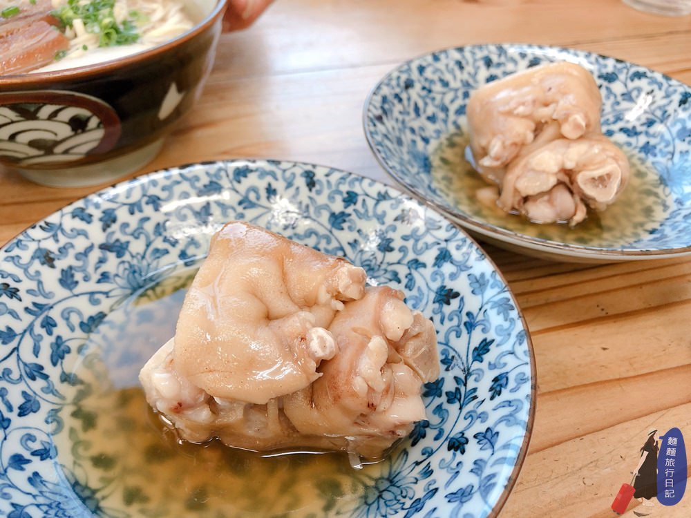 如果點沖繩豬腳麵的話,豬腳跟麵是分開的,豬腳會另外用盤子裝,玉家沖繩麵的豬腳看起來滷的比較淡色一些,醬油色是淡淡的琥泊色,不像台灣都滷的黑嚕嚕這樣,豬腳上感覺有滿滿的膠原蛋白,油脂跟膠原蛋白一閃一閃亮晶晶的在呼喚我吃牠。