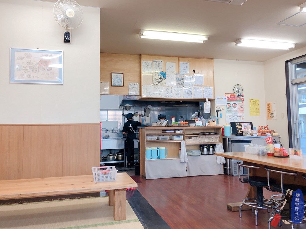 店裡很整潔乾淨寬敞,餐廳進來後右邊是廚房、跟一個簡單的櫃台出餐區,有兩個服務員在廚房煮麵、忙碌著。