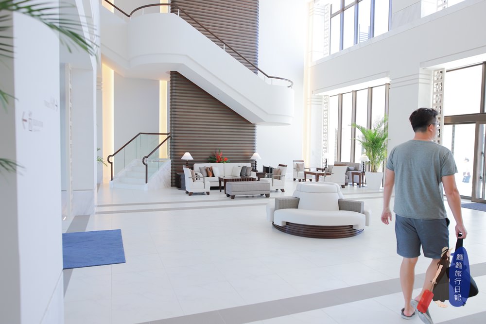 飯店裡幾乎都是白色色系非常清爽,原本就很高挑寬敞的大廳,看起就更大了! 哈哈哈,真的超大~都不怕波仔、樂樂跑啊跳啊撞到什麼的,一整片白色看過去很休閒舒適!櫃檯是24小時服務,村長要開啟度假模式啦~