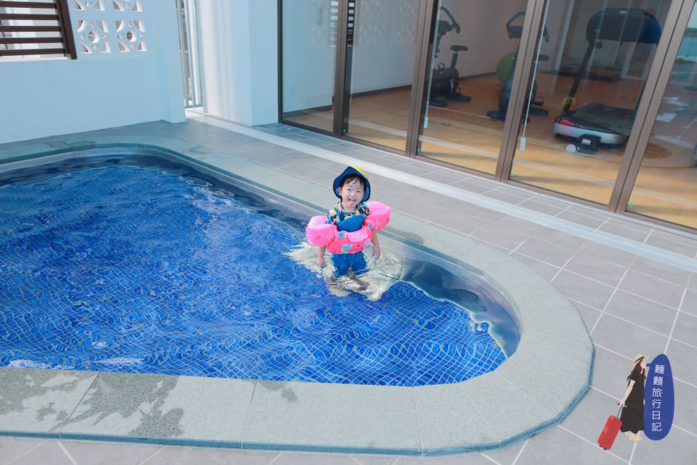 旁邊還有一個低水位的小泳池,你們看樂樂在裡面,水位只到腰部而已,一旁也有提供小朋友的浮板跟救生衣,但沒有很多~建議村民們還是可以自己帶,波仔跟樂樂的泳圈是充氣式,消氣後放在行李裡面也不會佔太多空間。