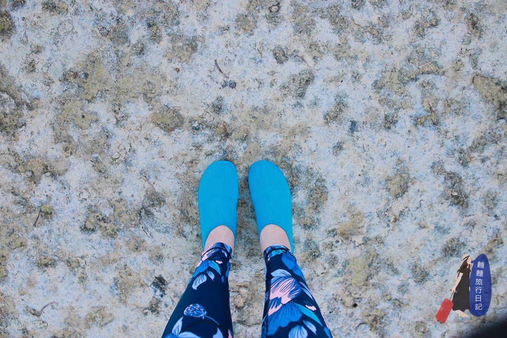這裡幾乎都是珊瑚礁岩石,所以需要全副武裝才不會刮傷喔!村長穿著水陸兩用鞋、長袖防磨衣和衝浪長褲下海!