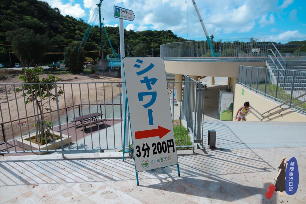 玩水區的樓梯走下去旁邊就有廁所跟沖洗區,沖水區要額外付200元日幣,就可以讓小孩沖3分鐘的澡,也是很便宜~ 廁所跟沖水區外面就是可以看到小魚小蝦的河,剛好拍到後面在施工~~~