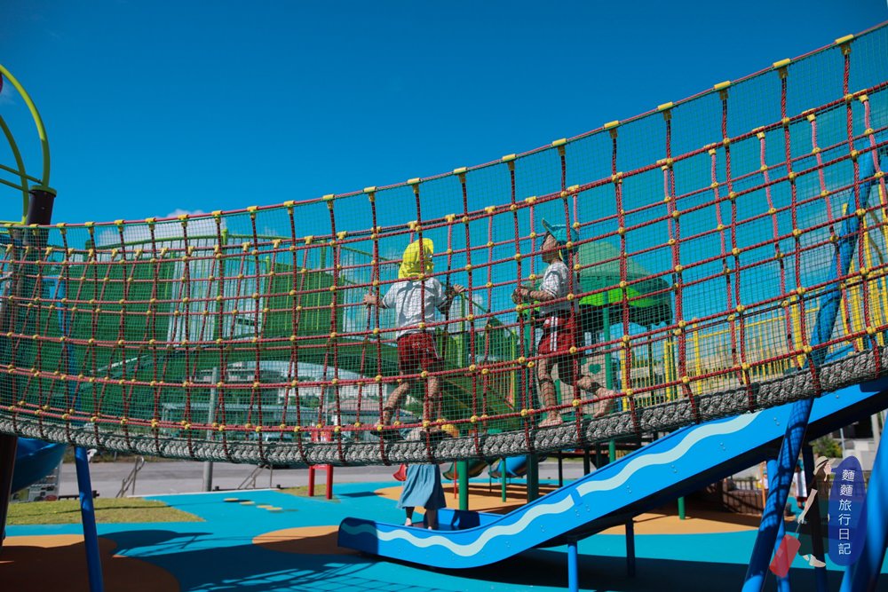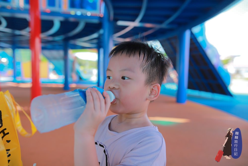 設施旁邊都有飲料販賣機,你們看波仔玩到滿頭大汗,村長買了販賣機的運動飲料給波仔跟樂樂喝~這裡因為是道の駅宜野座漢那休息站,所以除了這個兒童的遊樂設施還有可以欣賞風景的景觀台、可以用餐的咖啡廳跟餐廳跟買當地農特產的商店,就跟台灣的休息站一樣喔~有廁所跟特產商店街還有餐廳、景觀台,但是村長真的超級愛這個兒童設施的設計耶!建議台灣的休息站也可以學習一下啊~
