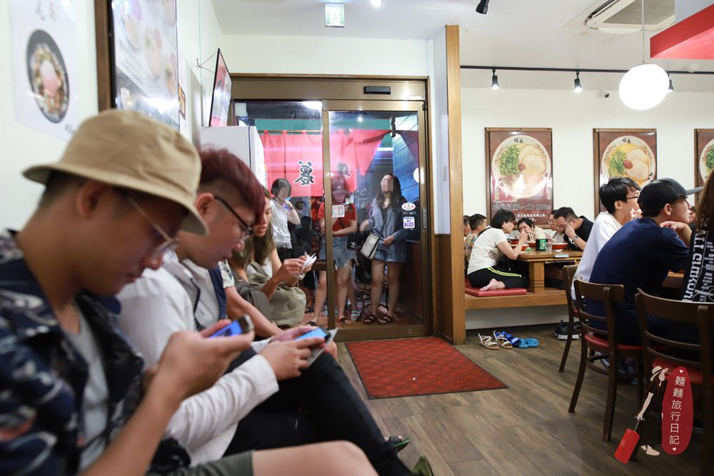 沒錯,你沒聽錯😂 不要以為踏進店裡就可以吃拉麵了,店裡入口區有一排椅子可以讓排隊的人坐著等,是L型的~~~村長這個時候已經在L的尾巴了,快、排、到、囉!YA~~~這次只排了15~20分鐘,還有椅子可以坐捏~
