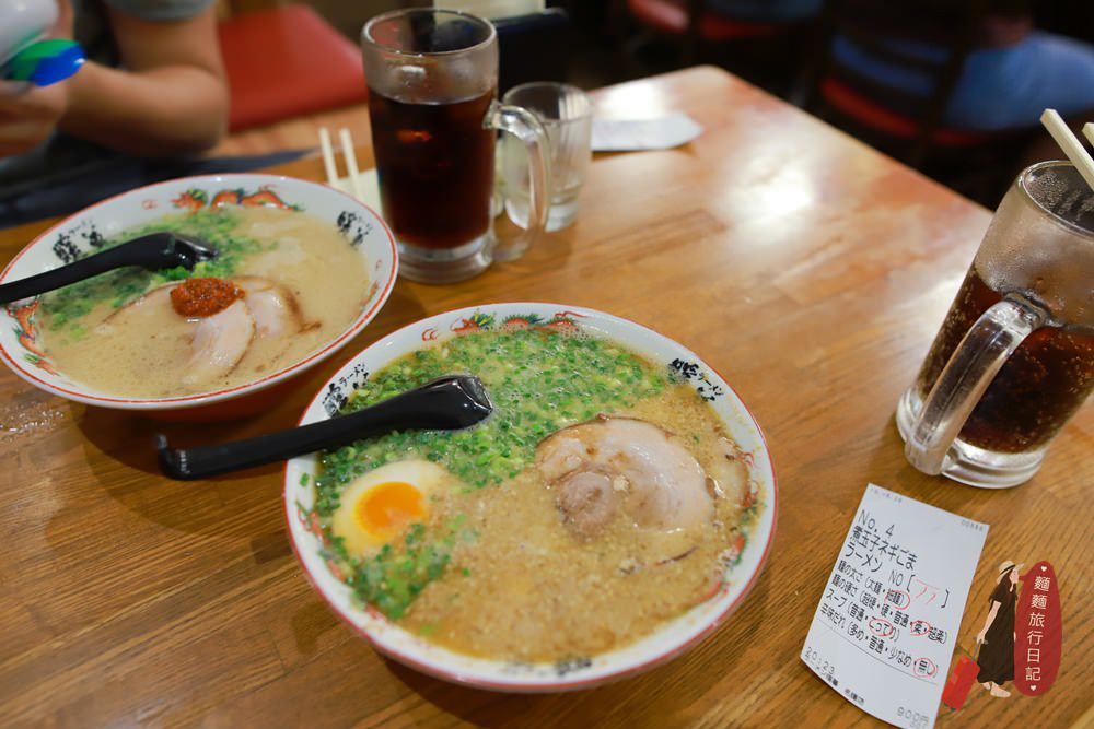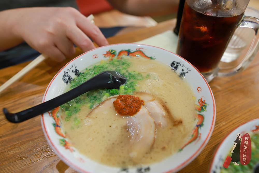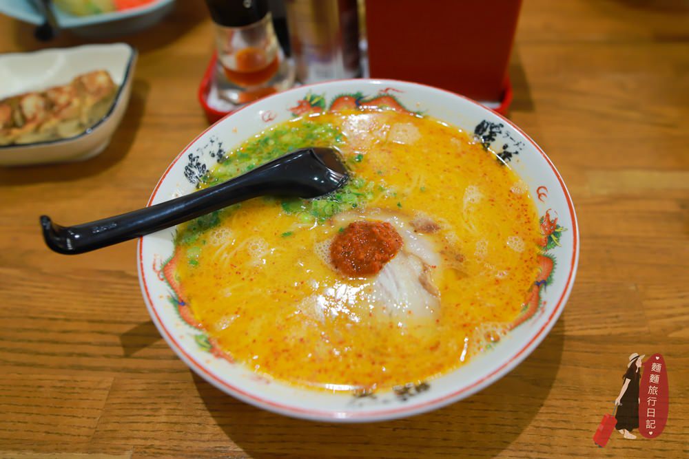 愛吃辣的村民啊,拜託一定要點這碗烈火拉麵,我跟大猴都超愛吃辣,無辣不歡,走到哪一定會點一碗辣味噌拉麵,濃厚的豚骨加上辣呼呼的味增,真是香辣過癮啊!辣度大概是小辣~中辣之間,好吃!另外大家有看到拉麵旁邊的博多一口餃子嗎?這是村長的一個習慣,吃拉麵必點煎餃,我覺得暖暮的餃子好好吃,皮薄多汁,而且內餡很有味道~根本不用沾醬。