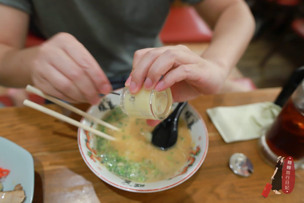 大猴很愛大蒜,他愛大蒜的程度應該是僅次於我之後吧!桌上的調味料有辣油、蒜泥、胡椒粉、煎餃專用醬油、辛子高菜(很像酸菜的食物,好像就是酸菜,感覺加在拉麵裡很怪,所以動都沒動),眾多調味料當中,大猴當然毫不猶豫拿起他最愛的蒜泥,加了很多很多很多進去,大家不要學大猴,母湯加太多,暖暮的蒜泥裡面好像有加鹽巴捏~加太多會太鹹!建議大家可以拉麵吃到一半之後再加其他調味料,這樣一碗拉麵吃出兩種味道~