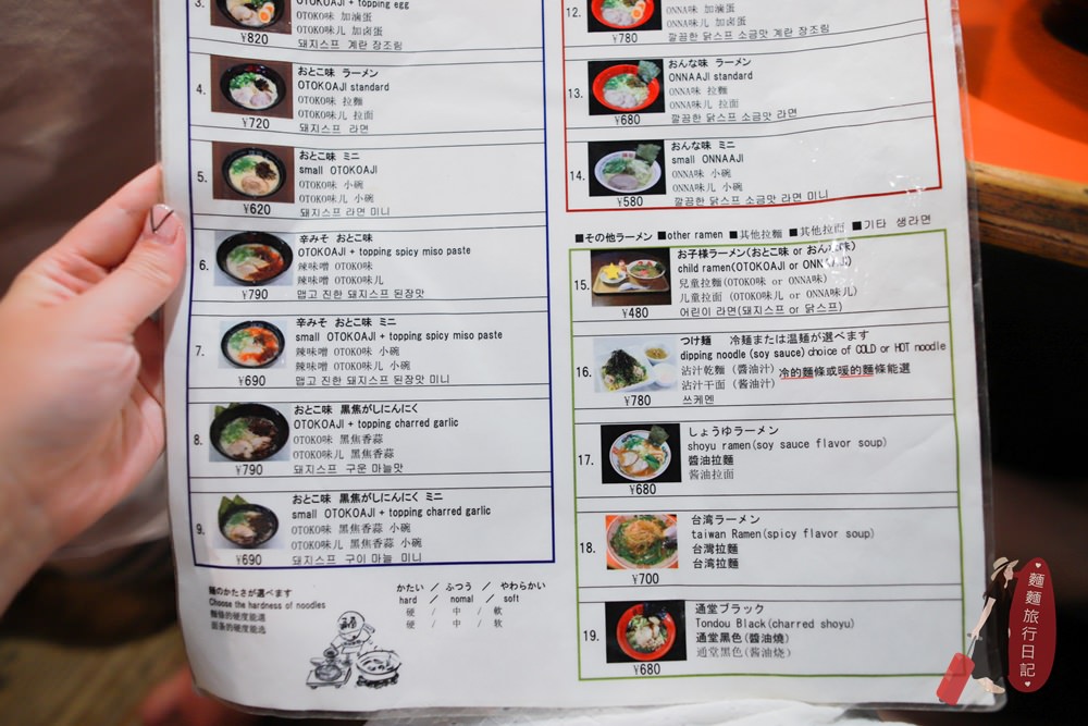 左右兩邊只是湯頭不一樣,配料好像都差不多~ 藍色是男人麵 (豚骨高湯)、紅色是女人麵(雞骨高湯)